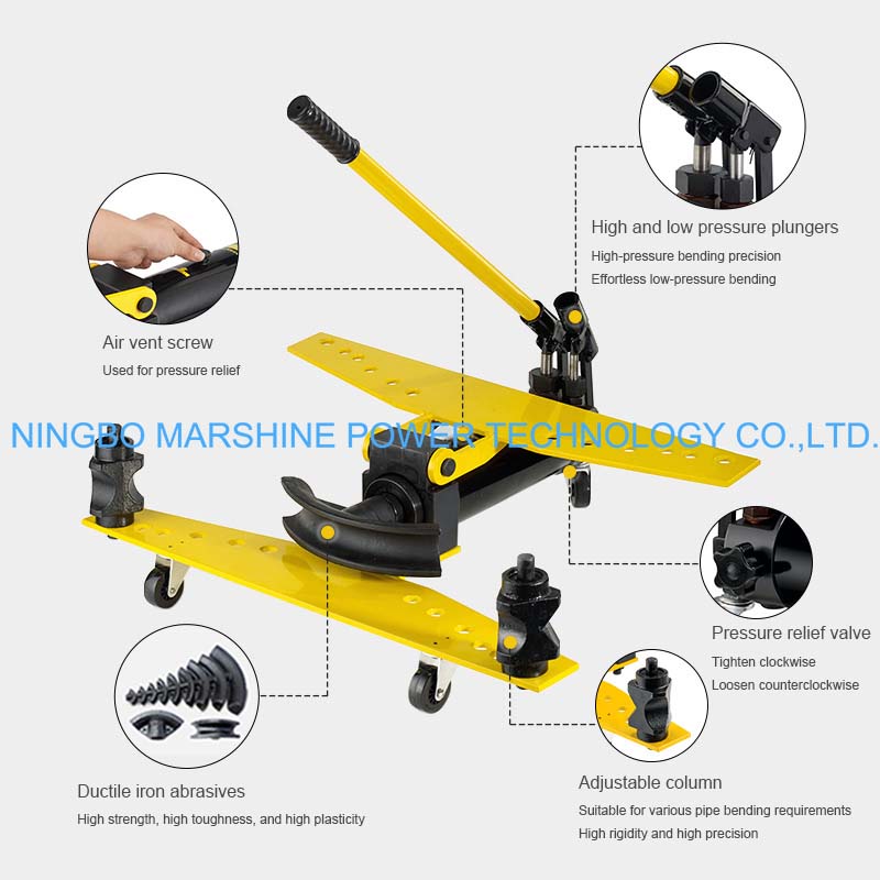 Our MARSHINE SWG Manual Type Hydraulic Pipe Bending Equipment is a small but high efficient pipe forming tool for bending over round metal pipes with higher precision and lower energy consumption. Using a manual hydraulic system, this machine can provides you with wedge power and can be used to make smooth, wrinkle-free pipe formations. Its rigid metal frame and portability allow on-site installation, perfect for use in electrical, plumbing, and pipeline construction works and more. With changeable bending dies and good hydraulic performance , the pipe bender could be feasible for accurate pipe forming works.